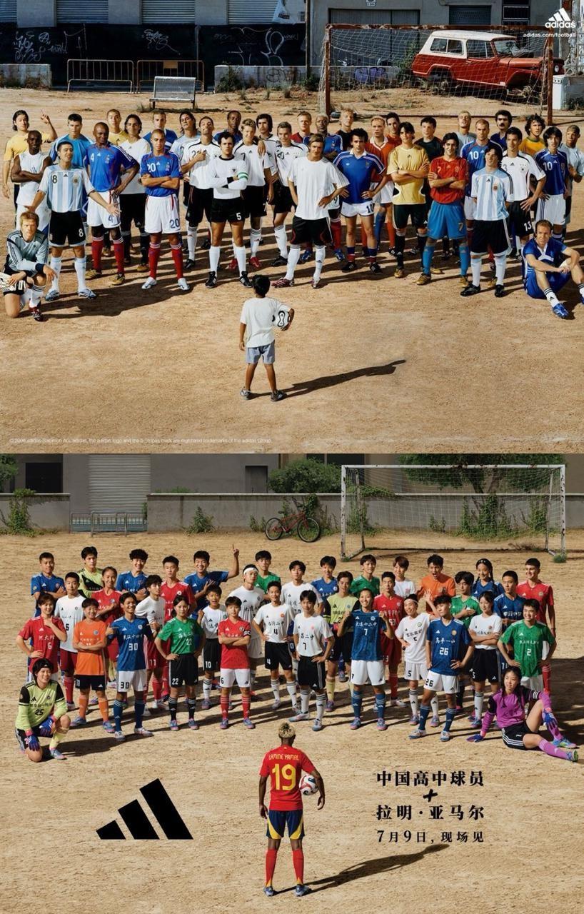 雖然這是17歲的亞馬爾第一次來到中國參加活動,但在去年8月,他就通過阿迪達斯與中國高中生運動員們互換了球衣和作業,那張火爆全網的亞馬爾手捧“五三”圖也是在那時候產生的。2024年12月,亞馬爾榮膺世界金童獎,成爲“2024年優秀畢業生”,2025年6月,阿迪達斯爲CHFL總決賽推出了宣傳海報,中國高中球員與亞馬爾復刻了那張經典的“何塞+10”,續寫了19年前的經典,這張海報也出現在上海、北京等多個城市的CBD,給許多人留下了深刻的印象。