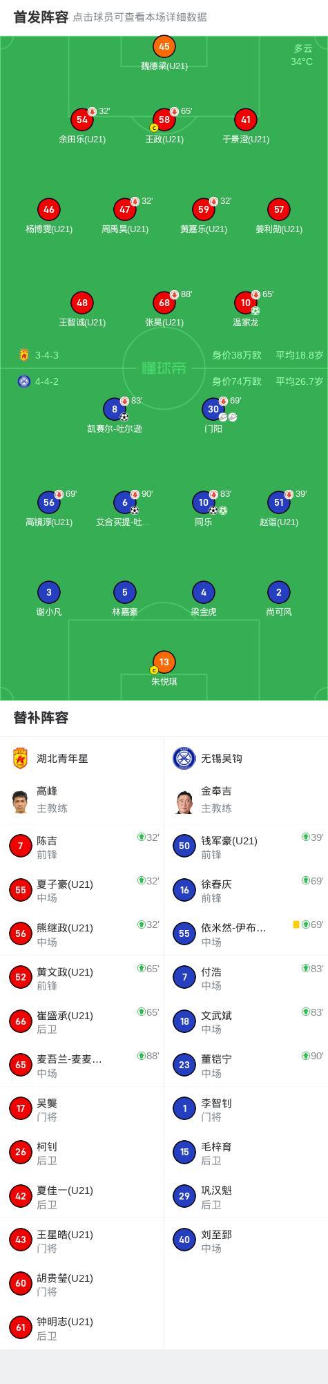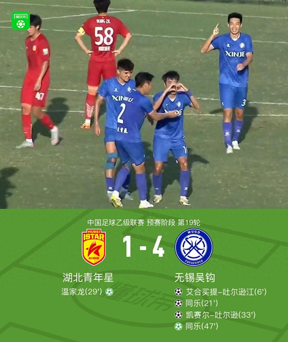 北京時間7月13日中國足球乙級聯賽預賽階段第19輪,湖北青年星坐鎮主場迎戰無錫吳鉤。比賽第6分鐘,無錫吳鉤球員門陽送出助攻,幫助艾合買提-吐爾遜江首開紀錄。第21分鐘,門陽再次送出助攻,同樂推射破門擴大比分。第29分鐘,湖北青年星球員溫家龍主罰點球命中,爲球隊扳回一城。第33分鐘,無錫吳鉤球員凱賽爾-吐爾遜冷靜施射,將比分進一步拉開。下半場開始後,第47分鐘,同樂主罰點球命中,完成梅開二度。最終,湖北青年星以1比4不敵無錫吳鉤。