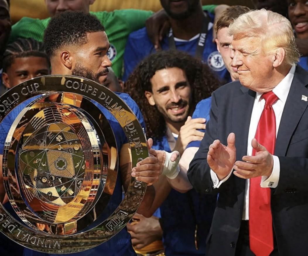賽後,切爾西隊長里斯-詹姆斯社媒曬出了捧杯照片,圖中特朗普與其對視。