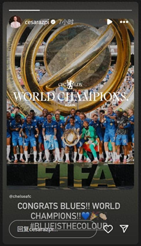 世俱杯決賽,切爾西3-0完勝巴黎聖日耳曼奪冠。賽後,切爾西功勳隊長阿斯皮利奎塔在個人社交媒體轉發了切爾西捧杯的海報,並附文稱:恭喜藍軍!!世界冠軍!!#Blue is the Colour。