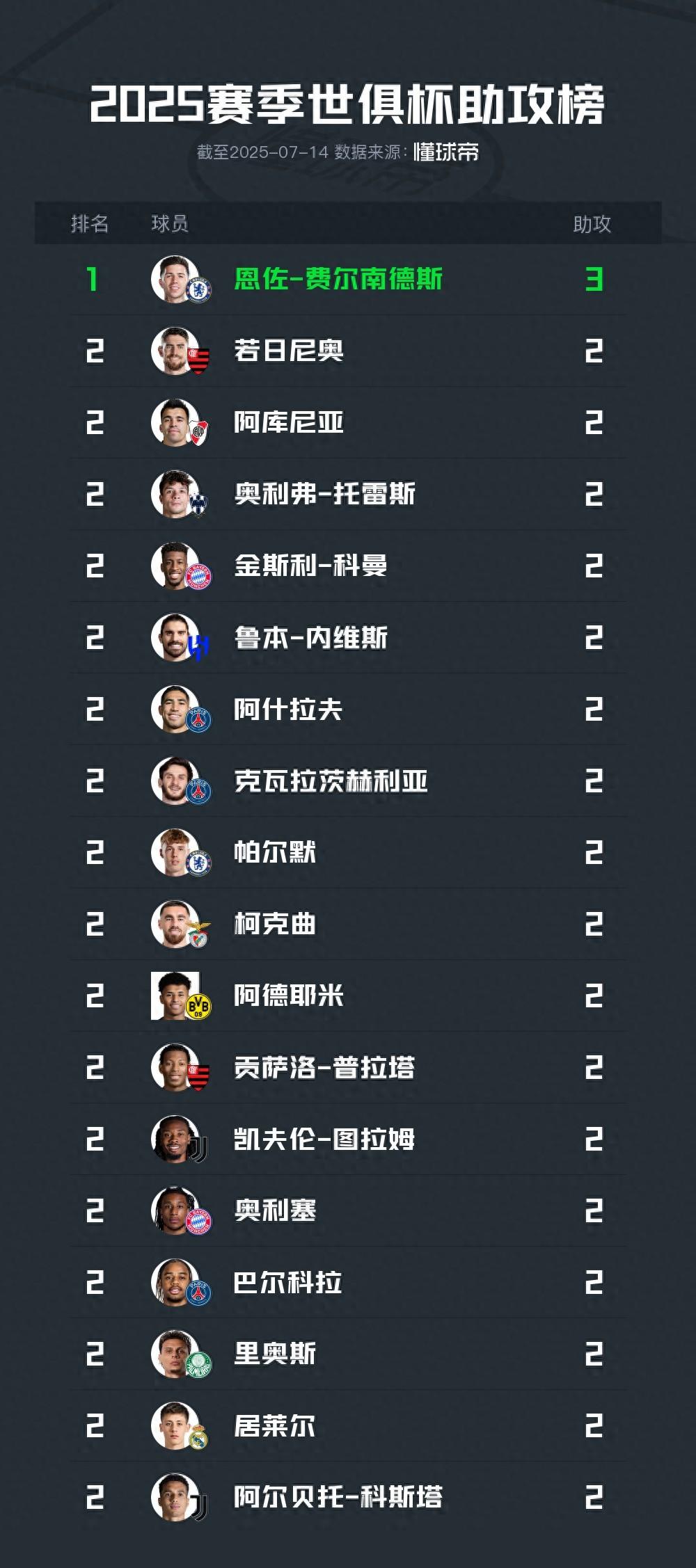 北京時間7月14日,在切爾西3-0擊敗巴黎聖日耳曼贏得本屆世俱杯冠軍之後,根據統計,藍軍的中場球星恩佐-費爾南德斯以3次助攻榮膺本屆賽事助攻王,其餘17名球員2次助攻並列第二。