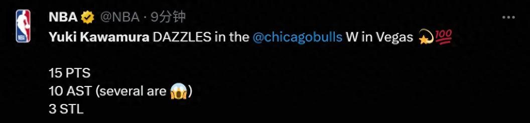 賽後,NBA官方更新社媒,對河村勇輝的表現進行了稱讚,NBA官方表示:河村勇輝在拉斯維加斯大放異彩,幫助公牛隊取得了勝利。