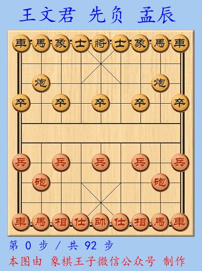 本番再鬥,王文君執先擺下仙人指路陣,孟辰應以卒底炮,佈局紅方右中炮黑飛右象,紅左相開邊。