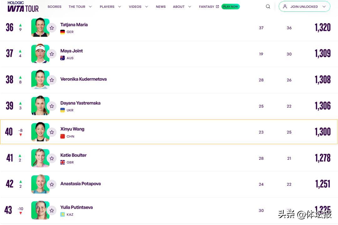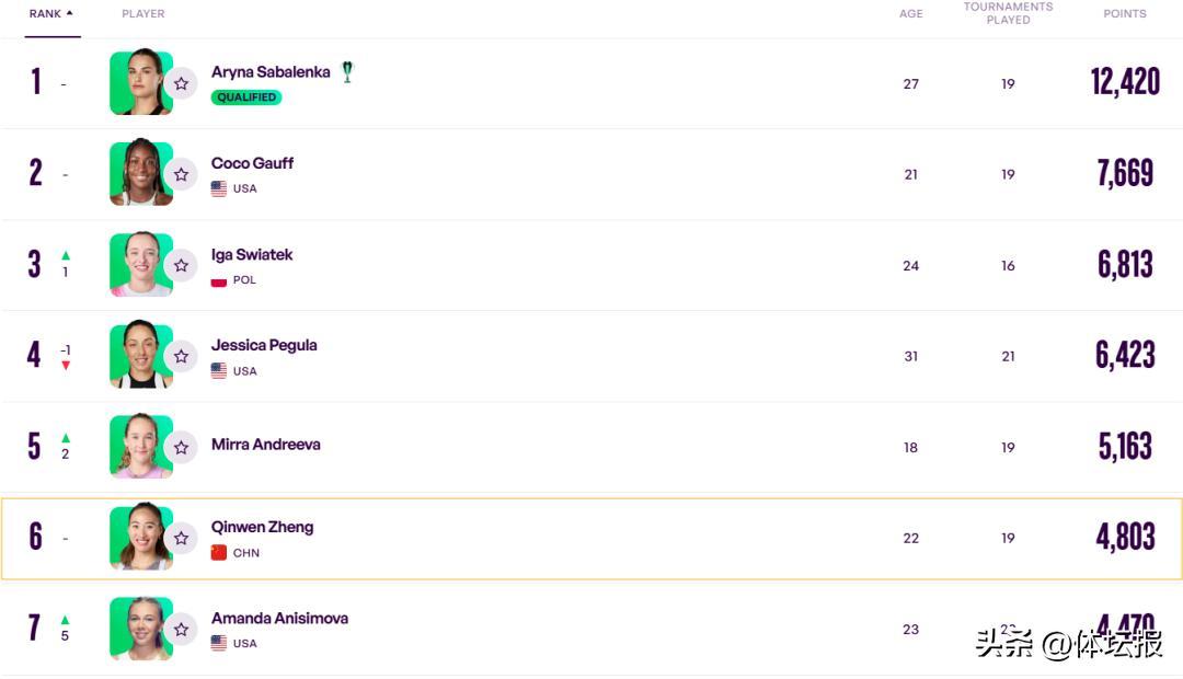 WTA最新排名:鄭欽文世界第6,王欣瑜第40