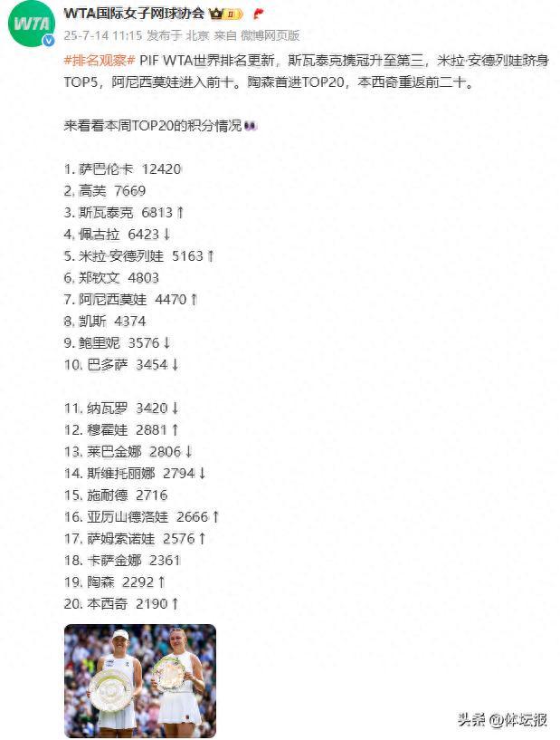 北京時間7月14日,WTA世界排名更新,薩巴倫卡領先高芙近5000分排名第一,新科溫網冠軍斯瓦泰克重回第三。中國“金花”中,鄭欽文積4803分位列第六,草地賽季表現不俗的王欣瑜排在第40名。