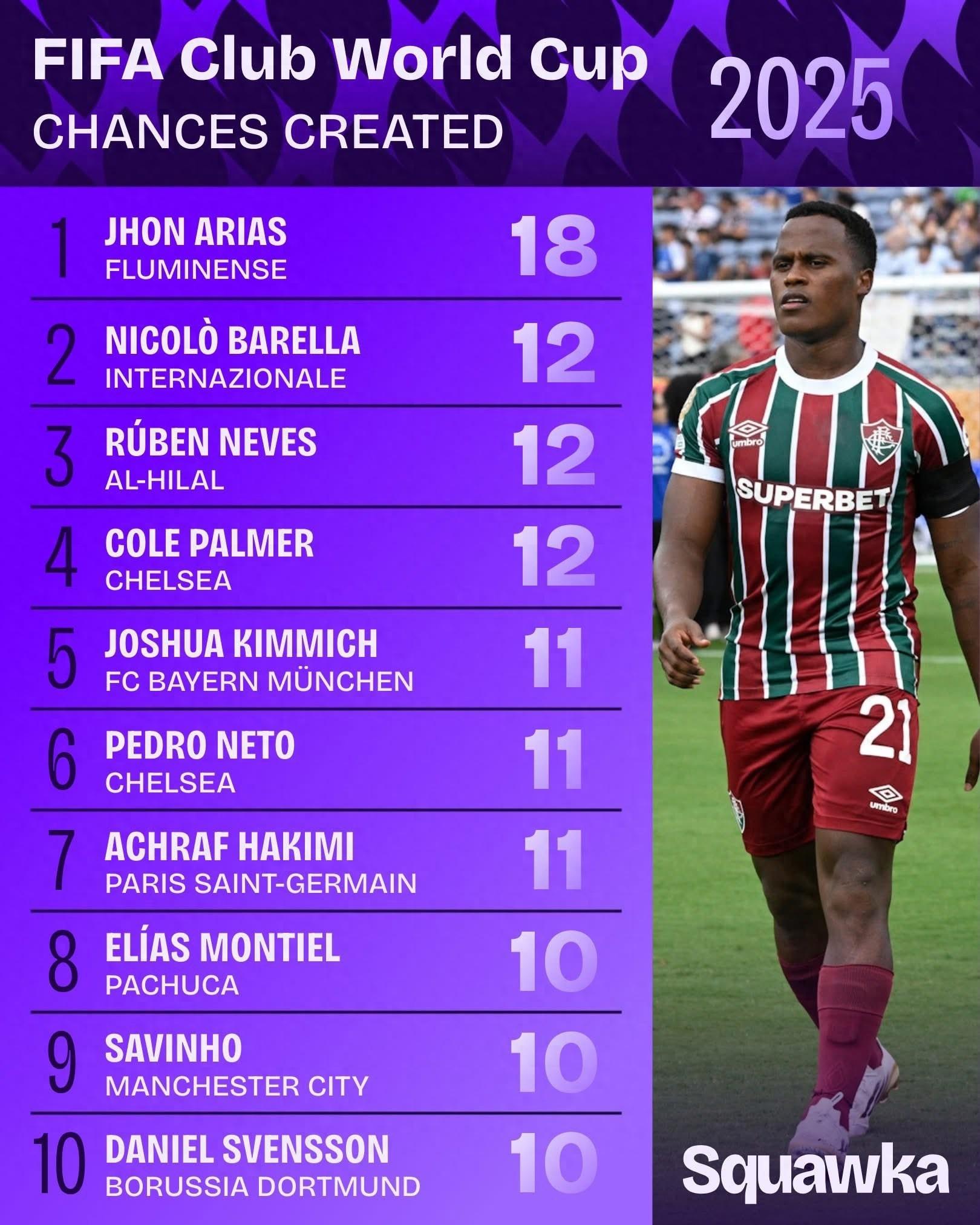 2025年國際足聯世俱杯創造機會數最多球員榜單: