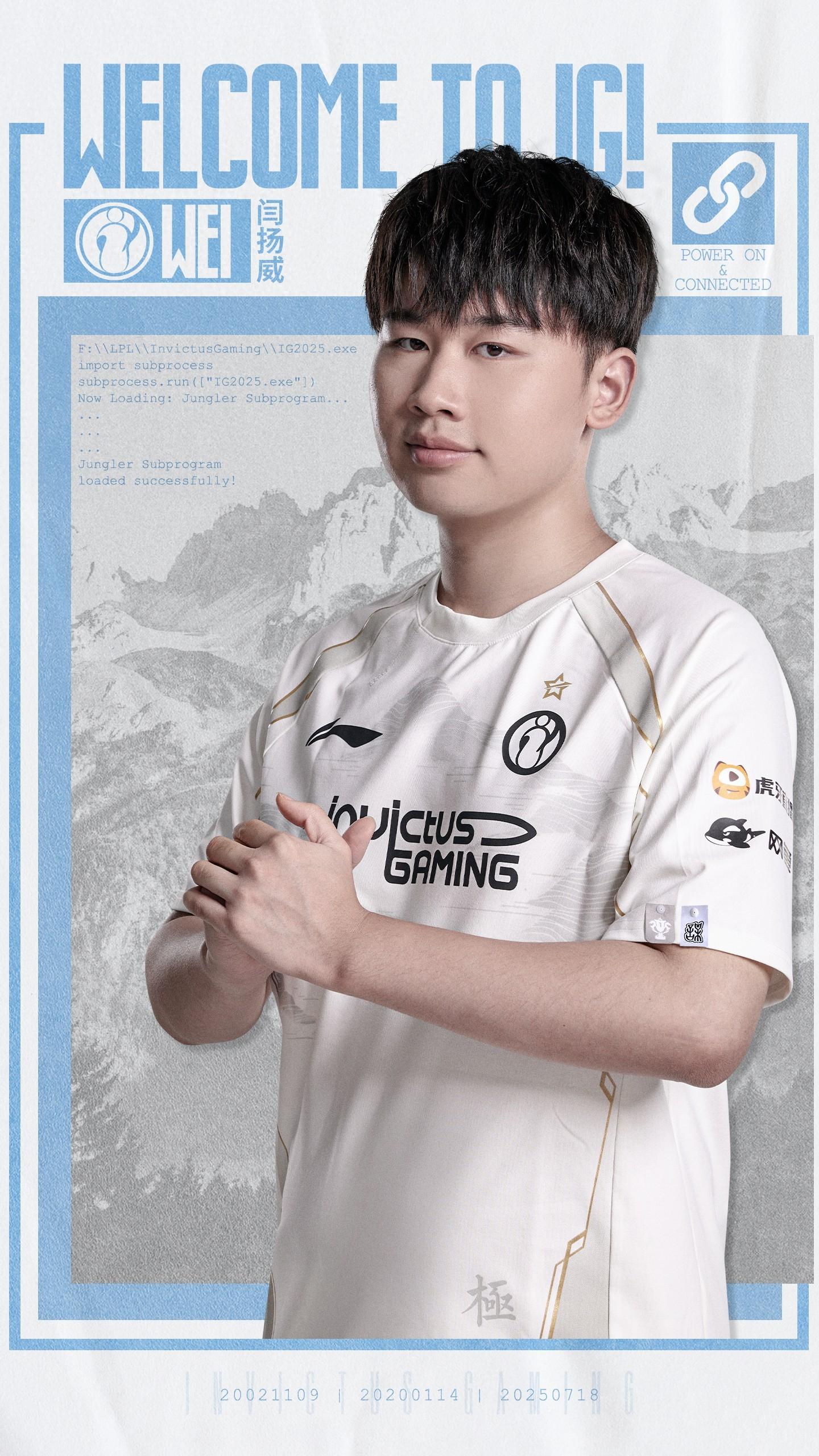 經過與選手的積極溝通以及友好協商後,我們高興地向大家宣佈: 即日起,選手閆揚威(ID:Wei)正式加入iG英雄聯盟擔任打野位。