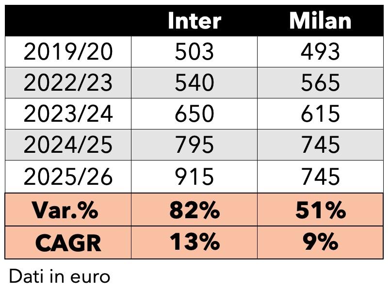 總體而言,AC米蘭的複合年增長率(CAGR)普遍維持在6%到10%之間,因此較國際米蘭更爲溫和。