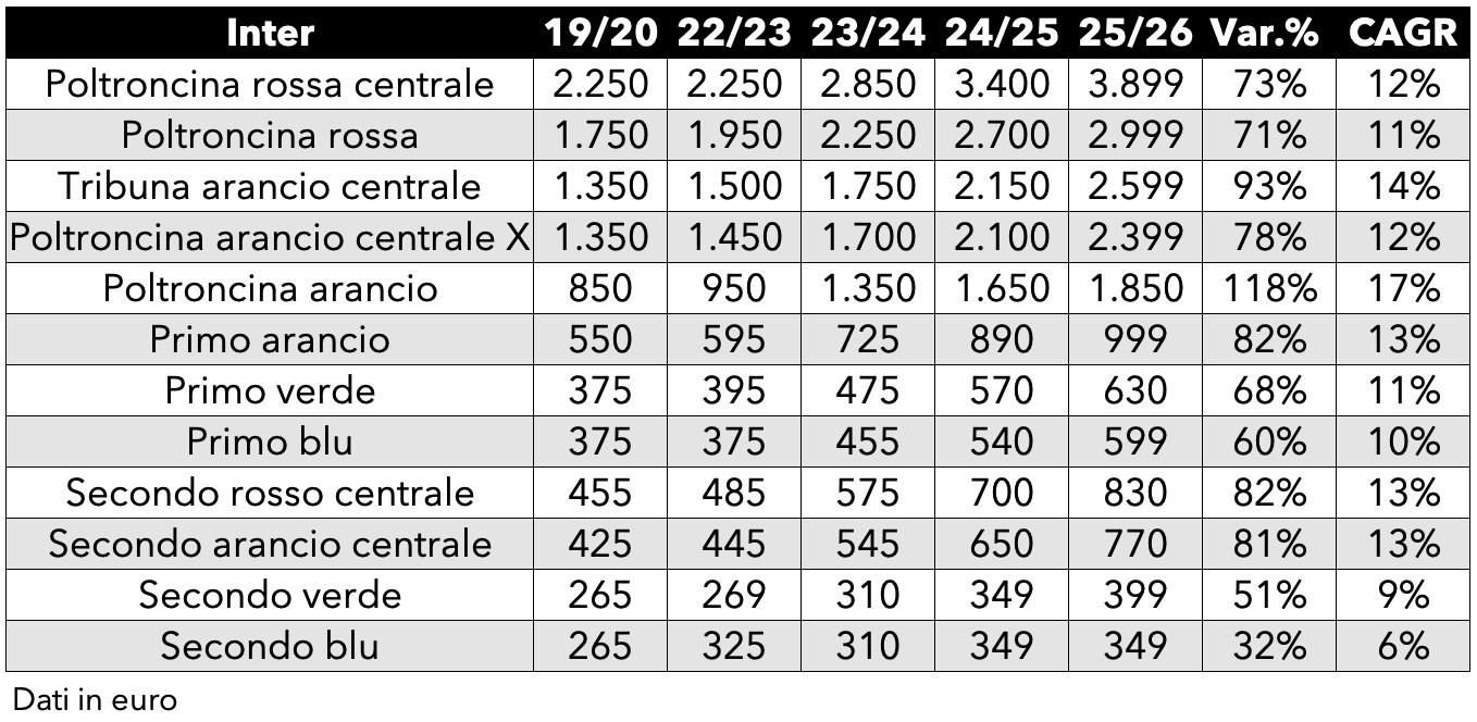 國際米蘭的季票價格逐步上漲,在2025-26賽季達到頂峯,某些區域的漲幅接近甚至超過了2019-20賽季價格的兩倍。“橙區座位”是漲幅最大的類別:從2019-20賽季的850歐元飆升至2025-26賽季的1,850歐元,總漲幅高達118%,複合年增長率(CAGR)爲17%。