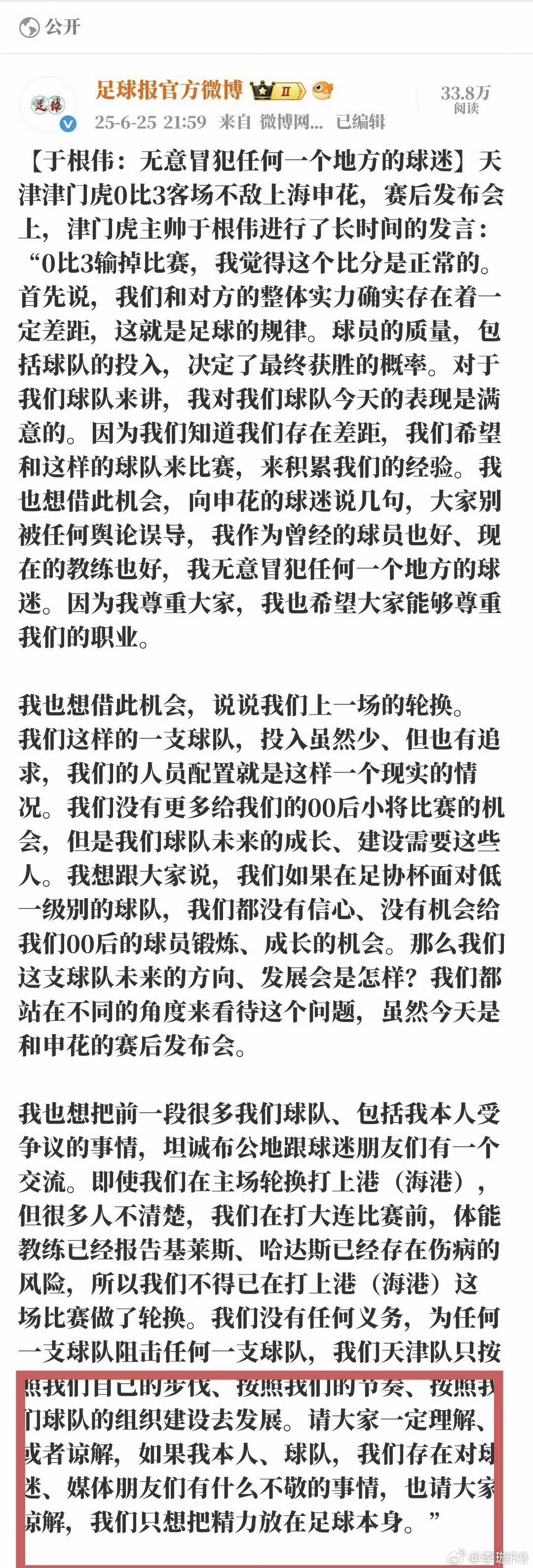 咱們偉大的天津足球旗幟于根偉指導,上次在上海被申花暴揍的時候說啥了?不是說你無意得罪球迷和媒體嗎?不是說做了什麼不敬的事情也請大家諒解嗎?那麼請問主教練兼總經理于根偉先生,你們官方微博公開罵人,這是不是你授意的呢?
