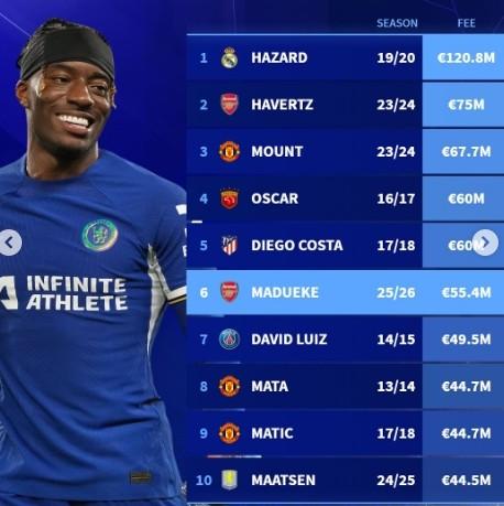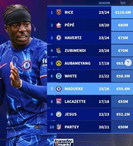 5540萬歐,馬杜埃凱爲槍手隊史第7貴引援及藍軍隊史第6貴轉出