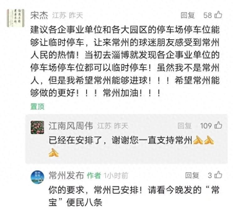 一名球迷留言道:“建議常州各企事業單位和各大園區的停車場停車位能夠讓臨時停車,讓來常州的球迷朋友感受到常州人民的熱情!”這名網友表示,雖然不是常州人,但是希望常州能夠進球,希望常州能夠做得更好,併爲常州加油。