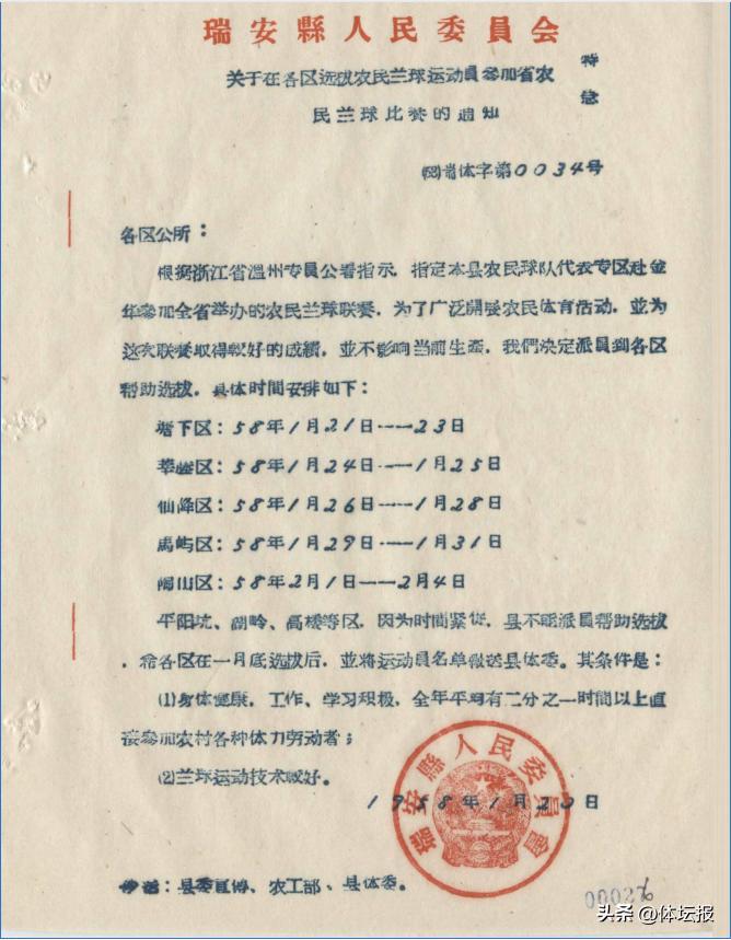 時光回溯:1958年1月,瑞安縣委發特急件,要求在各區選拔農民籃球運動員,積極備戰全省農民籃球聯賽。1959年12月,瑞安縣委又發文召集籃球運動員,訓練備戰全國乙級籃球賽。這些,應該就是點燃瑞安籃球夢想的星星之火。