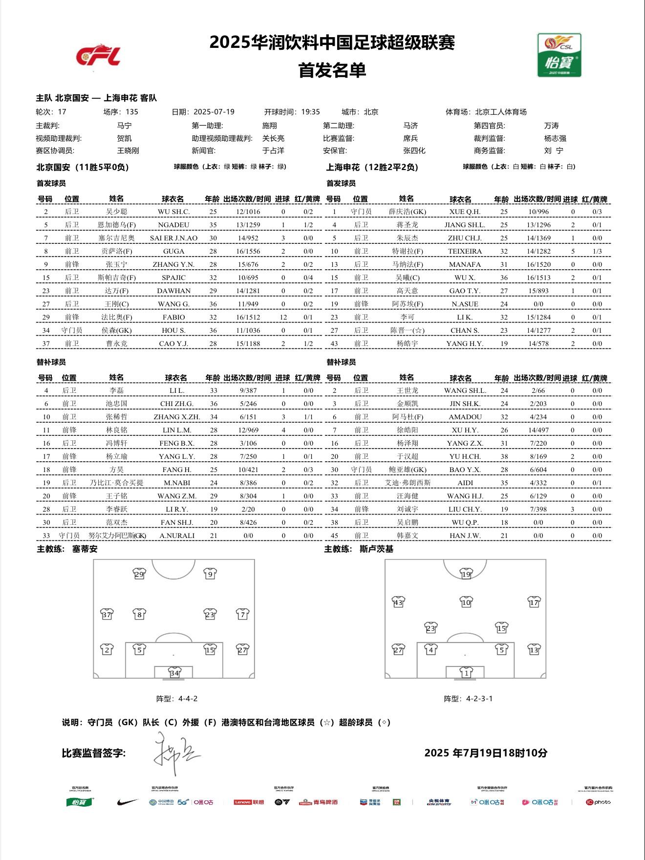 北京時間7月19日19:35,中超第17輪迎來京滬大戰,北京國安坐鎮主場北京工人體育場迎戰上海申花,本場主裁判爲馬寧,VAR裁判爲賀凱,賽前雙方首發出爐。