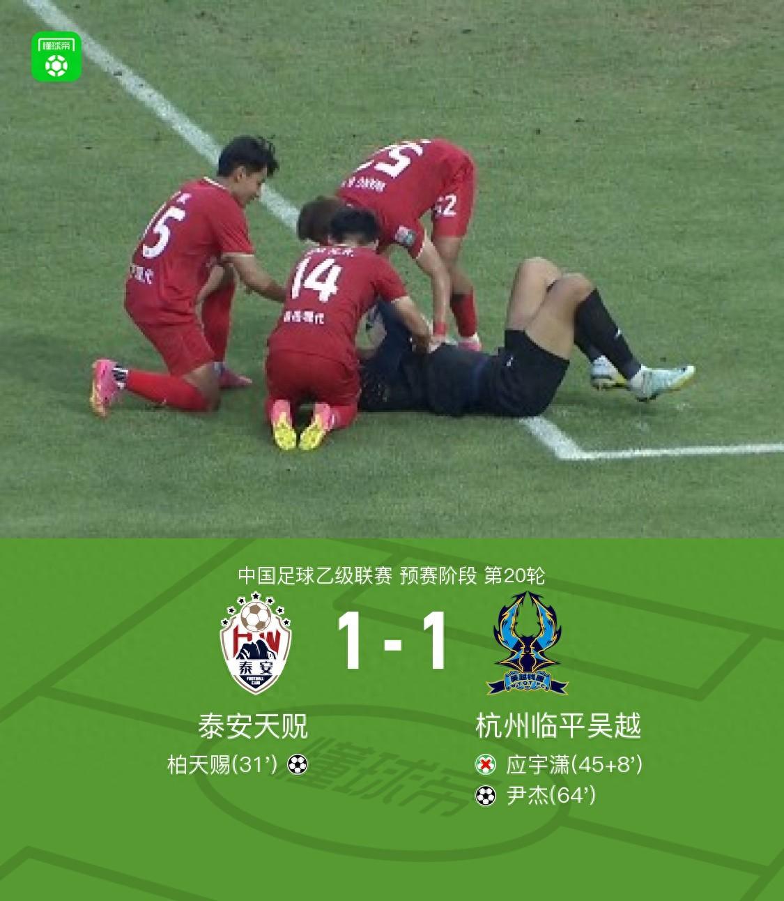 北京時間7月19日中國足球乙級聯賽預賽階段第20輪,泰安天貺主場迎戰杭州臨平吳越。比賽中,泰安天貺由李威送出助攻,柏天賜完成破門。杭州臨平吳越方面,謝龍飛助攻尹傑打入一球。上半場補時階段,杭州臨平吳越球員應宇瀟主罰點球未能命中。最終雙方以1-1握手言和。