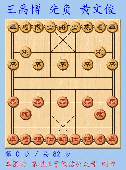 王禹博無法防守,仕相均被黑棋喫去,黑殺得興起,以車雙馬三子聯攻之威,奪喫了紅棋一炮,紅方82手丟子失勢告負,黃文俊致勝。