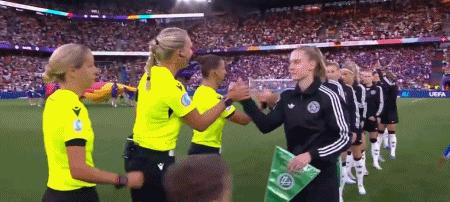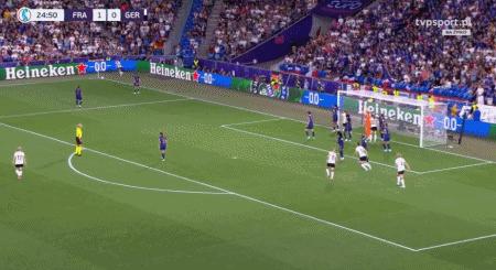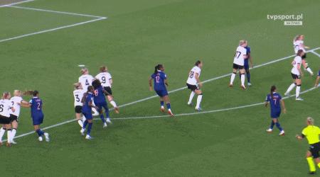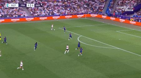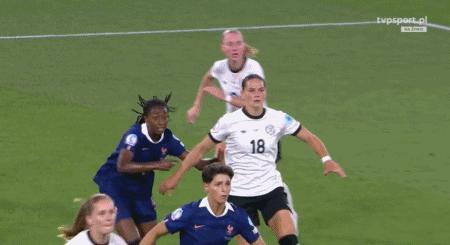 女足歐洲盃1/4決賽,法國女足以1比1戰平德國女足結束上半場。法國隊由熱約羅成功打入點球,德國隊則由尼斯肯接應隊友克拉拉-比爾助攻完成破門。比賽過程中,德國隊球員亨德里希因犯規被紅牌罰下。半場比分法國女足1-1德國女足。