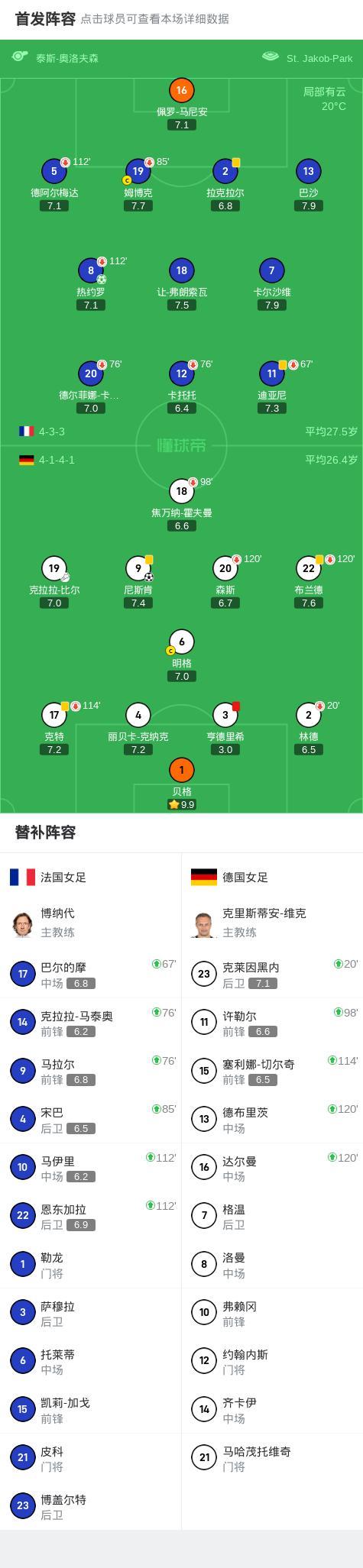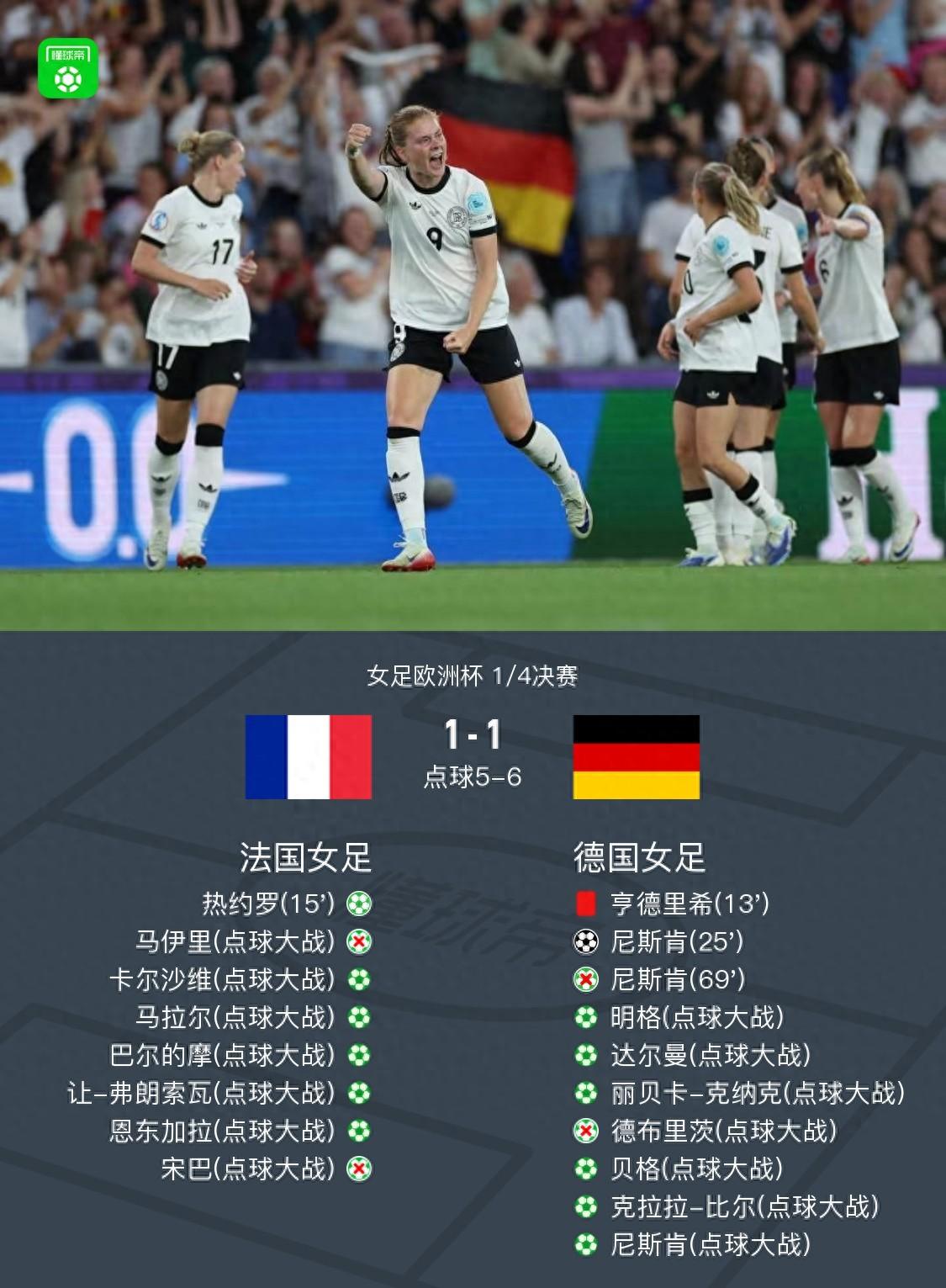 北京時間7月20日女足歐洲盃 1/4決賽,法國女足對陣德國女足。法國女足熱約羅破門。德國女足尼斯肯破門。最終比分法國女足 6-7 德國女足。