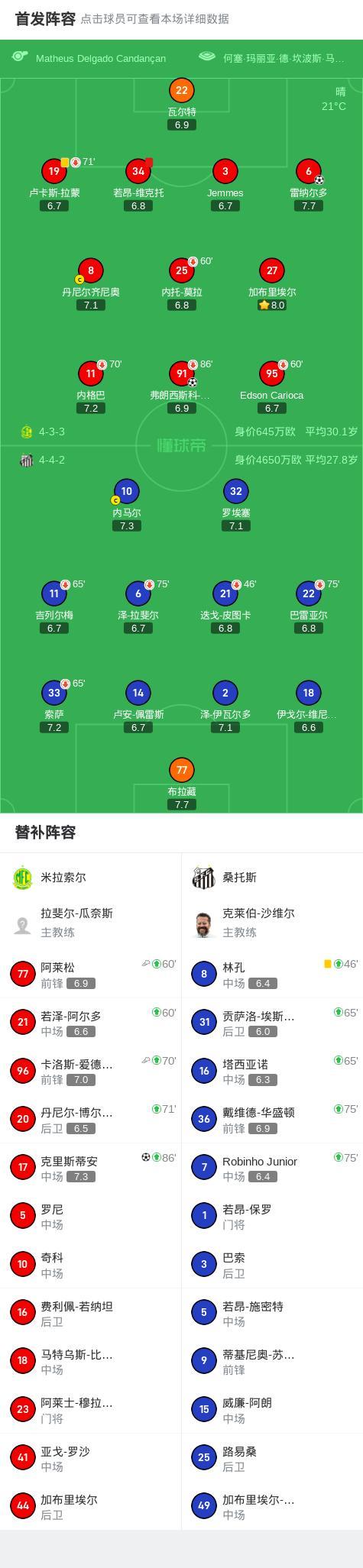 第69分鐘,角球開到後點,達科斯塔破門打破僵局,米拉索爾1-0桑托斯