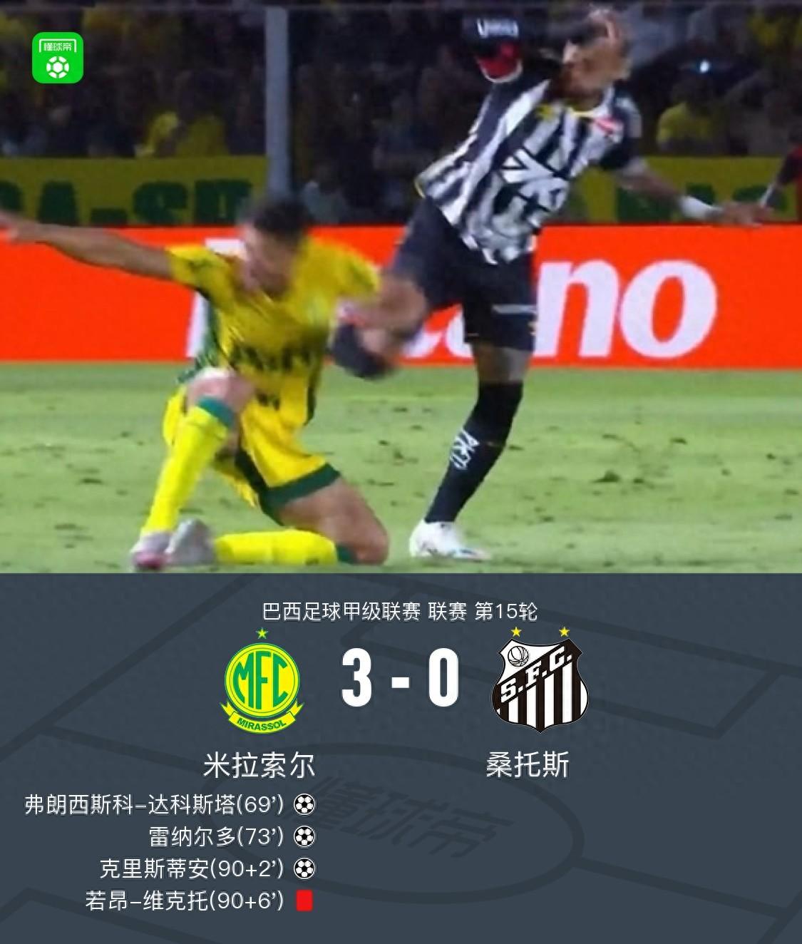 北京時間7月20日巴西足球甲級聯賽第15輪,米拉索爾主場迎戰桑托斯。比賽中,米拉索爾球員弗朗西斯科-達科斯塔率先打破僵局,隨後雷納爾多接隊友卡洛斯-愛德華多傳球后破門擴大比分。比賽進入補時階段,阿萊松送出助攻,克里斯蒂安再下一城。儘管米拉索爾在最後時刻少一人作戰,但依然將勝勢保持至終場。最終,米拉索爾以3比0戰勝桑托斯。