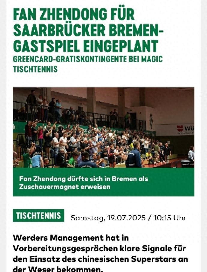 不萊梅發文寫道:不萊梅及周邊地區的乒乓球迷有福了!奧運冠軍樊振東作爲薩爾布呂肯乒乓球俱樂部新援,已確定參加10月5日(17:00)對陣綠白軍團的德甲客場賽事。