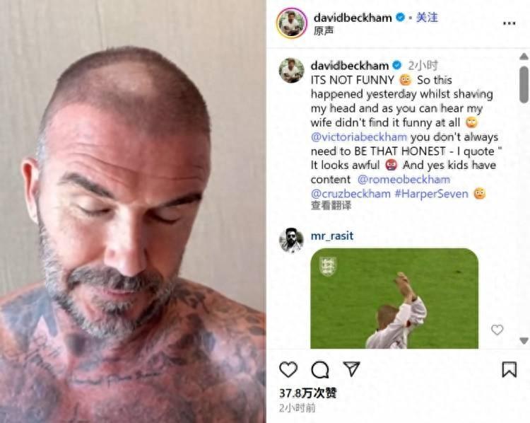 貝克漢姆寫到:“一點也不好笑!昨天理髮的翻車現場——如你所見,我老婆的吐槽堪稱無情,@維多利亞,實話實說也要分場合!”