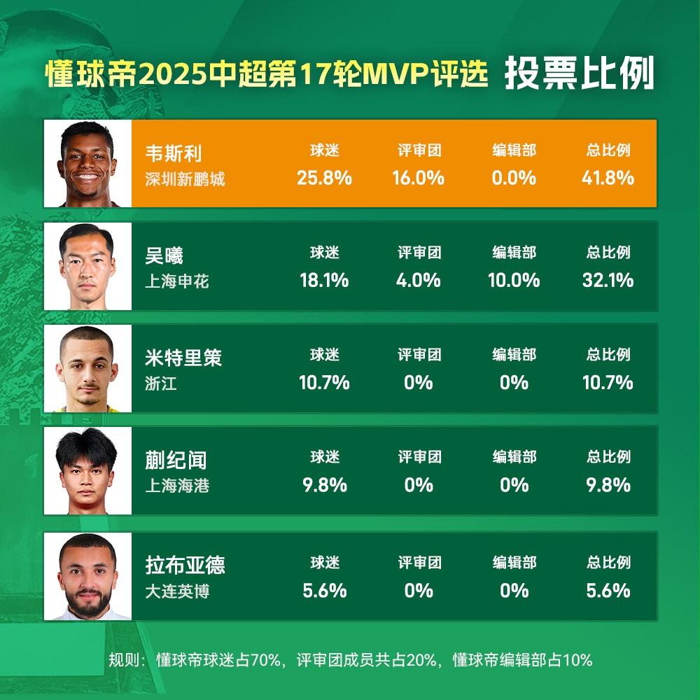 大家好,歡迎來到懂球帝2025賽季中超MVP評選現場。2025賽季中超第17輪MVP得主出爐,深圳新鵬城新援韋斯利首秀上演帽子戲法,力壓在京滬大戰表現出色的吳曦,當選本輪中超MVP!韋斯利也成爲基萊斯、李新翔、米特里策後,本賽季第四位中超首秀即榮獲MVP的球員!