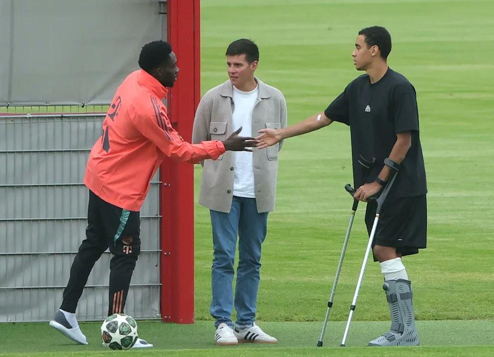 這是穆西亞拉自腳踝手術後首次拄拐公開亮相。這位拜仁球星在中午12:20一瘸一拐地走進場地,同行的還有好友阿方索-戴維斯(右膝十字韌帶撕裂)和球員事務主管默斯芒。