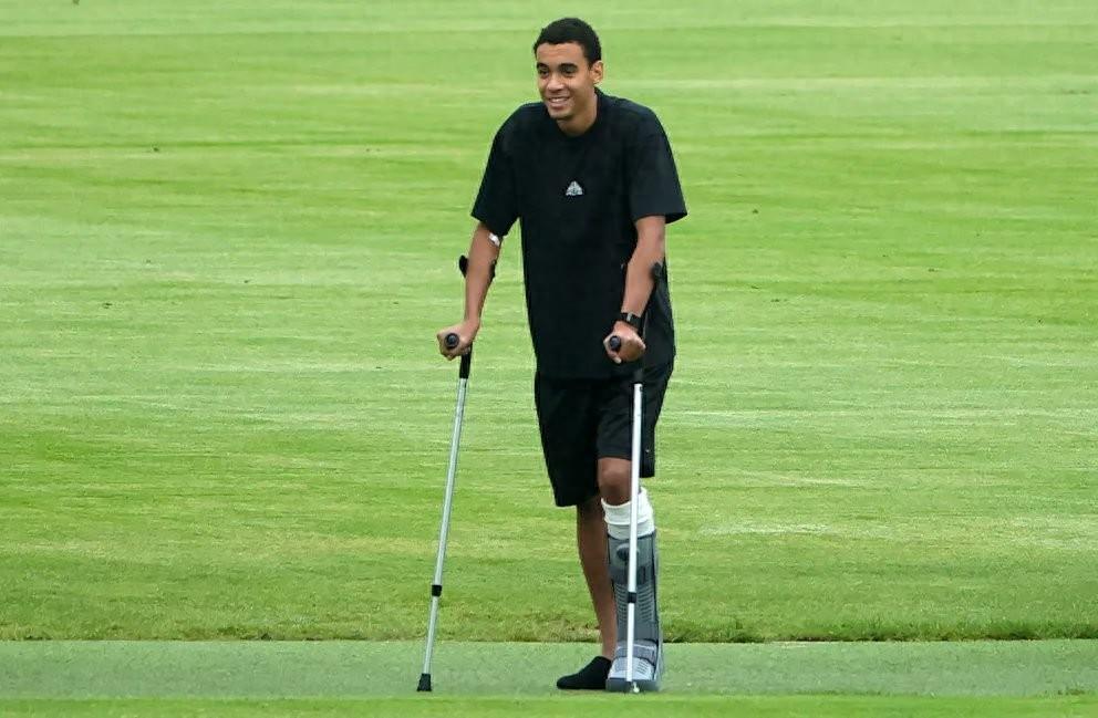 穆西亞拉身穿黑色T恤和黑色短褲,左腳穿着一隻灰色的專業康復鞋。他的左腳幾乎完全沒有用力。