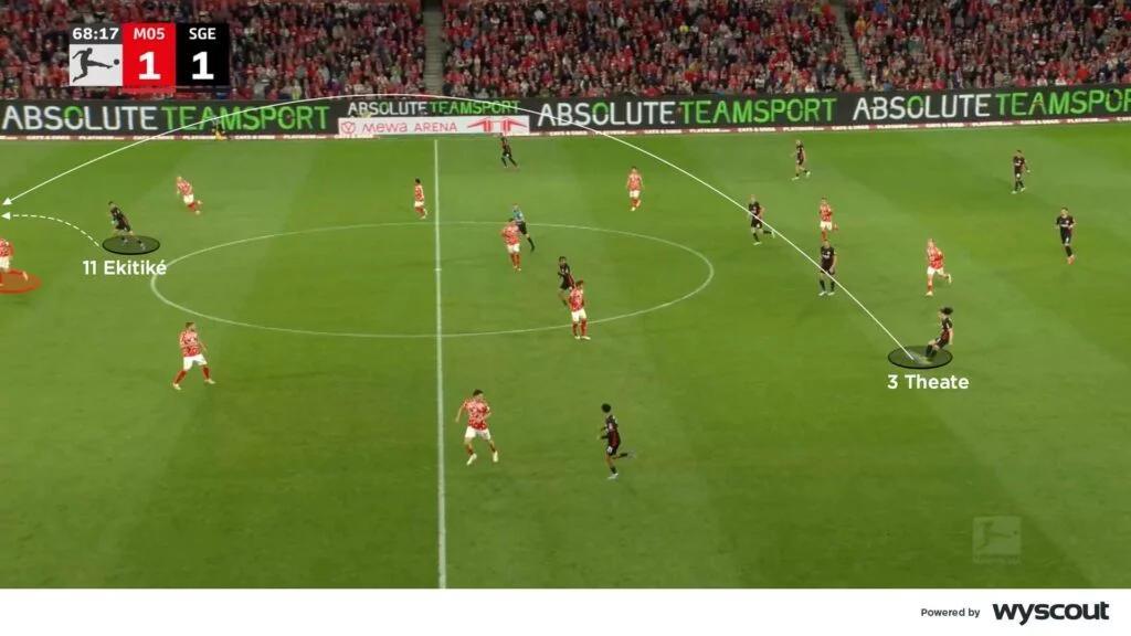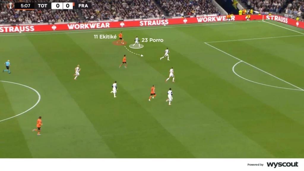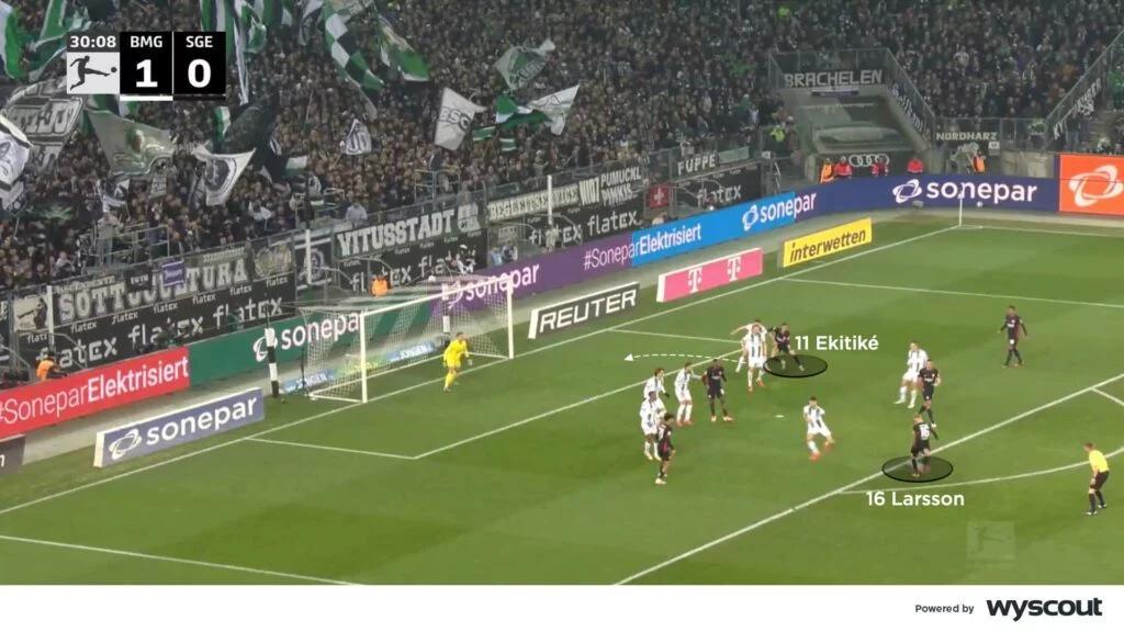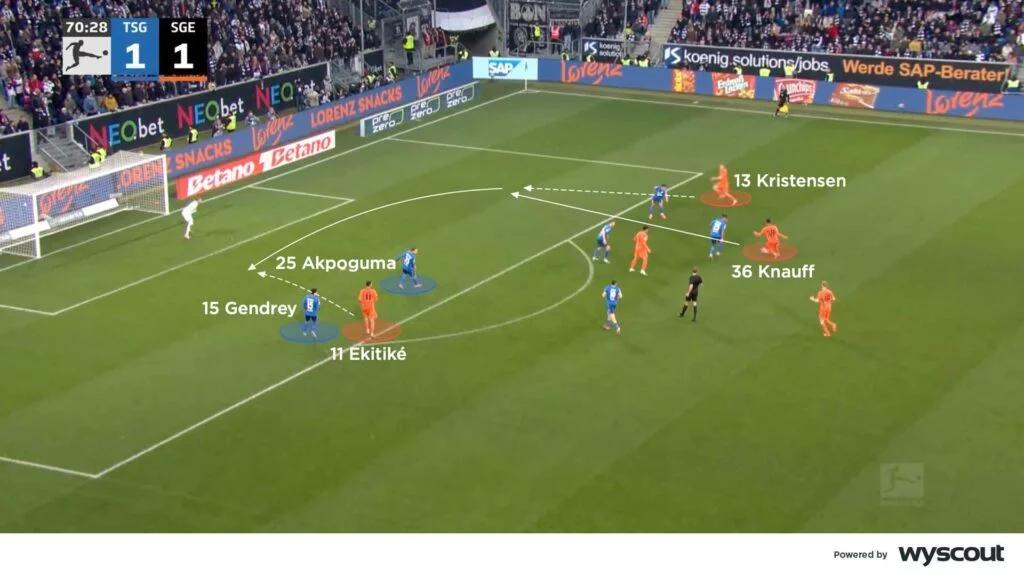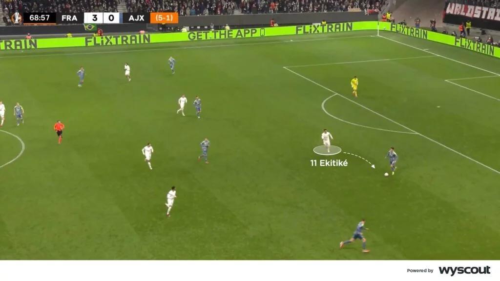 在組織進攻時,埃基蒂克在對方防線後方持續構成威脅。他身高1米91,卻擁有出色的加速能力和動態跑動。他喜歡繞到中後衛持球相對的一側,稍微弧線式地啓動,這樣可以更全面地觀察可以利用的空當。如果防守球員盯球,他能迅速插入身後;若防守球員提前應對他的假動作,他則會內切穿插。此時他的變速能力至關重要,可以在防守球員補位前獲得身位優勢。