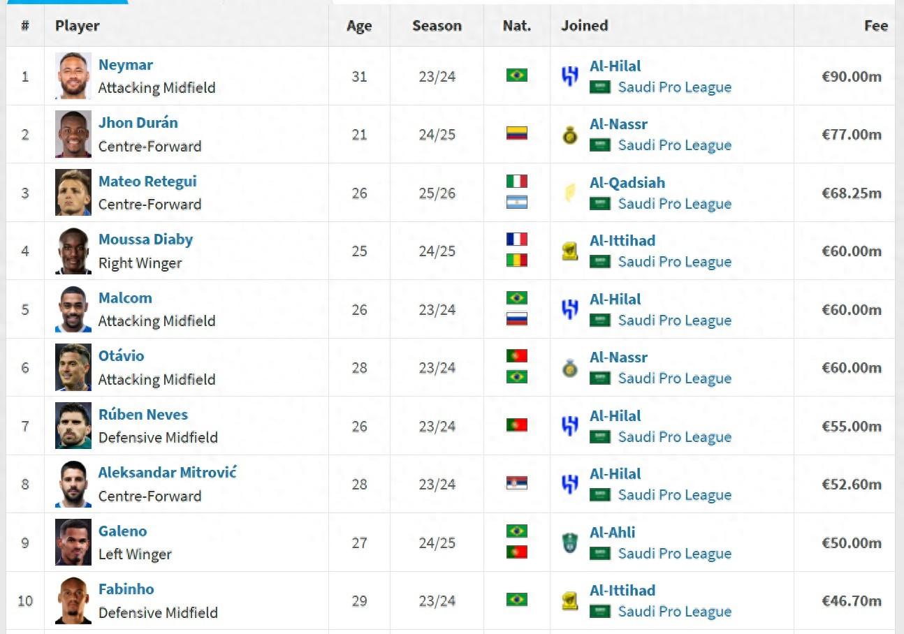 沙特聯賽引援花費TOP10:雷特吉6825萬歐第三,內馬爾第一