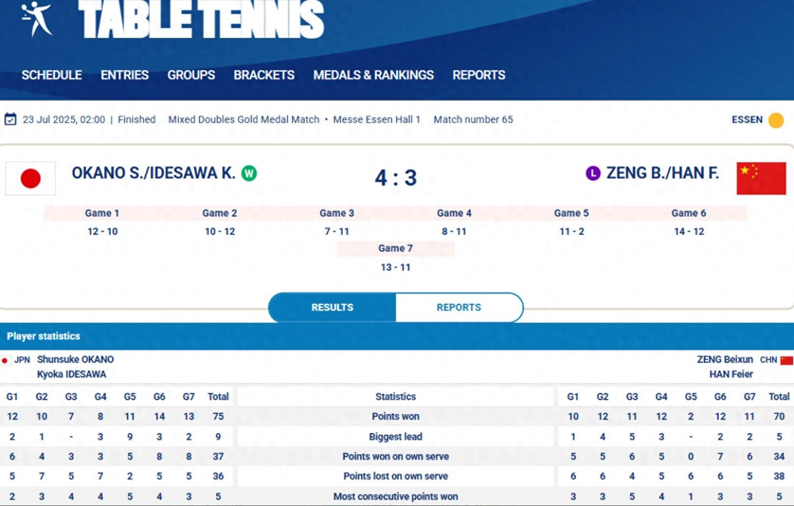 北京時間7月23日,世界大學生運動會乒乓球混雙決賽中,國乒組合曾蓓勳/韓菲兒以3-4惜敗給日本組合岡野俊介/出澤杏佳,獲得亞軍。