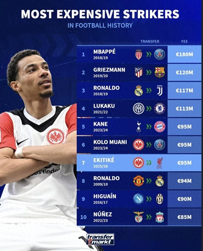 北京時間7月24日,在埃基蒂克以總價9500萬歐元從法蘭克福轉會至利物浦之後,德轉統計出了足壇歷史單次轉會費排名前10的前鋒,姆巴佩1.8億歐元排名第1,埃基蒂克位居第7位。