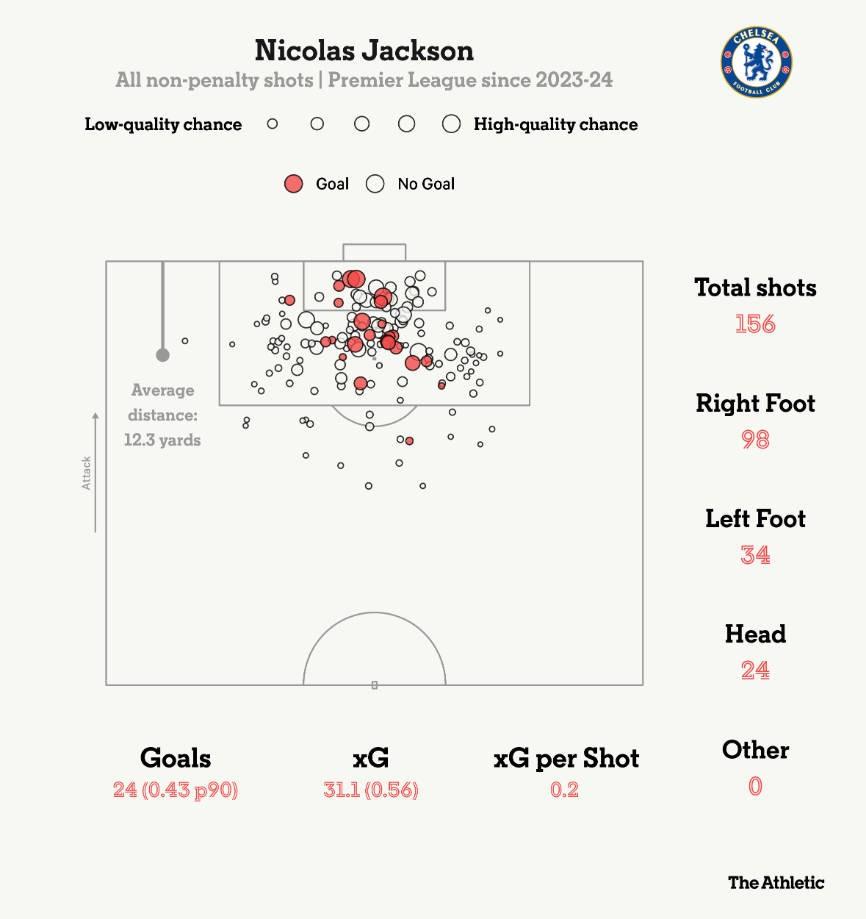 自從加盟切爾西以來,雅克松的射門圖顯示,他是一名能持續製造威脅的球員,他每次射門的預期進球值(xG)爲0.2——在此期間只有4名英超球員超過這一數值,這表明他有能力進入有價值的進球位置,此外,只有6名球員在小禁區內的射門次數比他更多。
