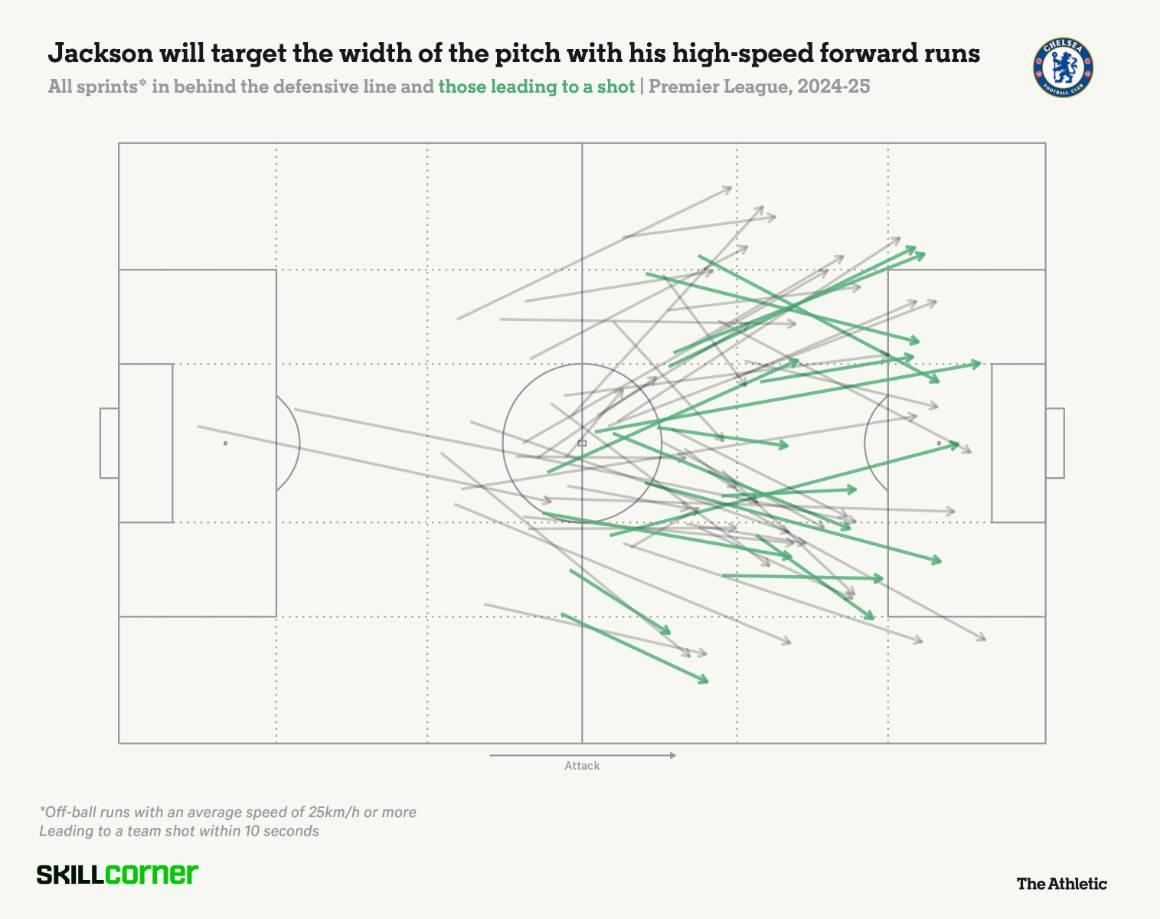 例如,在對陣維拉的比賽中,雅克松在球權轉換後迅速瞄準空間,快速衝向邊路,當球傳到庫庫雷利亞腳下時,雅克松爲切爾西提供了一個出球點。