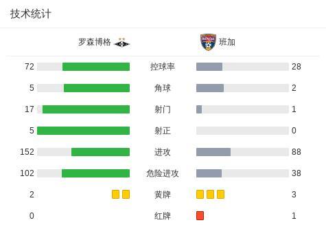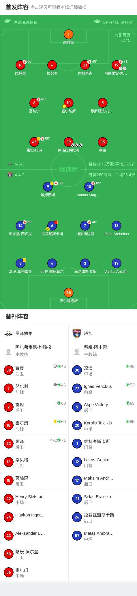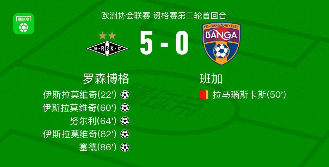 北京時間7月25日,歐洲協會聯賽資格賽第二輪首回合,羅森博格對陣班加。比賽中,羅森博格球員伊斯拉莫維奇完成帽子戲法,努爾利和塞德也各入一球,爲球隊鎖定勝局。班加球員拉馬瑙斯卡斯在第50分鐘累計兩張黃牌被罰下,進一步削弱了球隊的防守能力。最終,羅森博格以5比0大勝班加,佔據晉級先機。