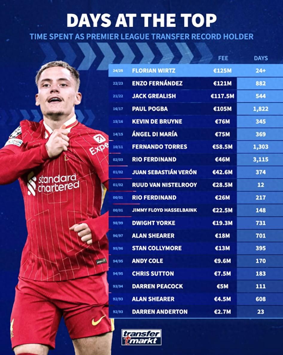 北京時間7月26日,德轉列出了英超歷史標王的霸榜天數,里奧-費迪南德、博格巴以及費爾南多-託雷斯排名前三,作爲英超歷史最貴引援的維爾茨目前霸榜25天。