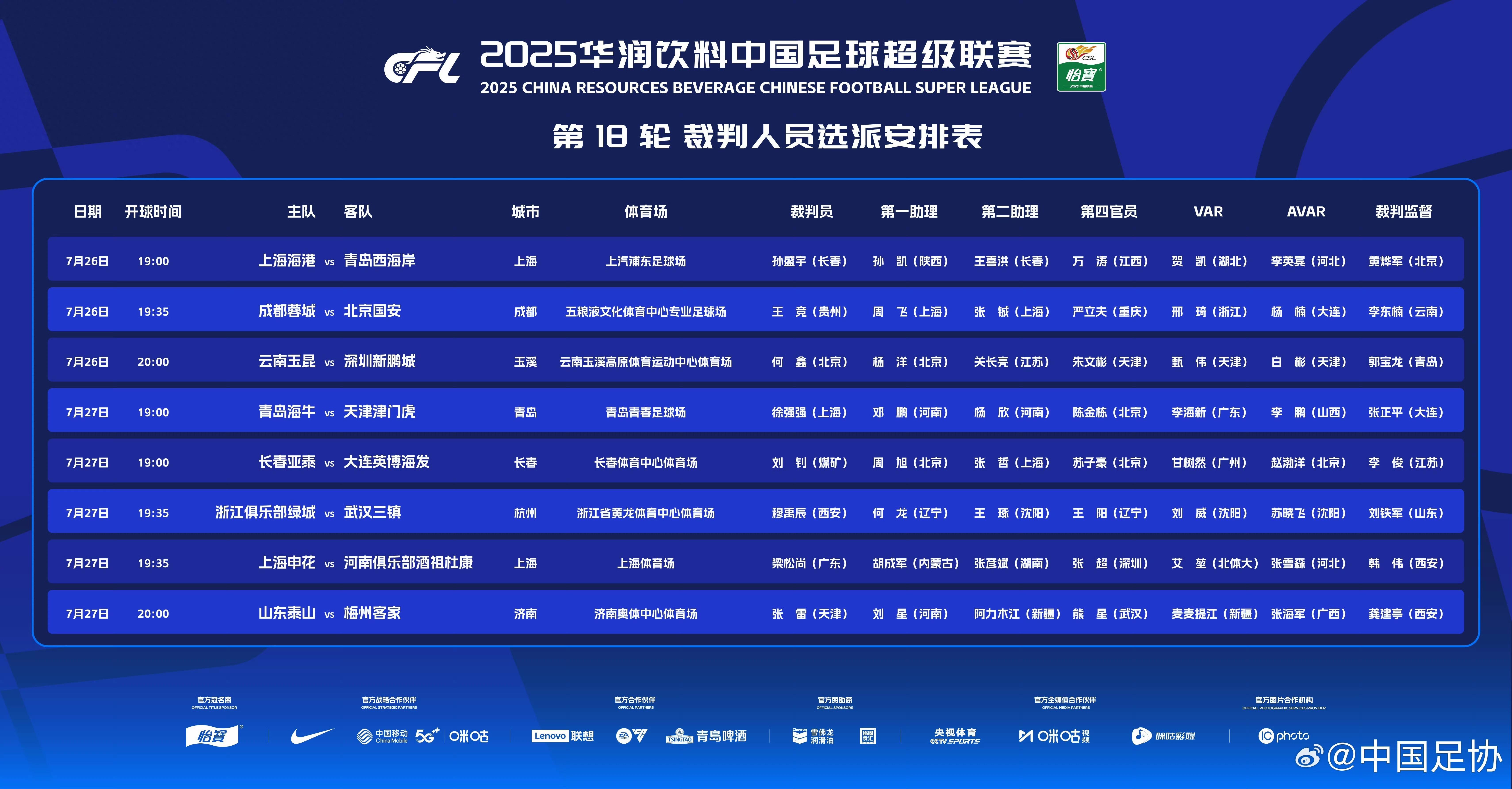 北京時間7月26日,中超第18輪的裁判名單公佈,王競執法成都蓉城vs北京國安,梁松尚吹上海申花vs河南。