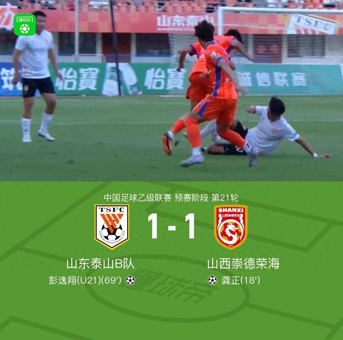 山東泰山B隊1-1山西崇德榮海,彭逸翔、龔正破門,何炳壯送禮