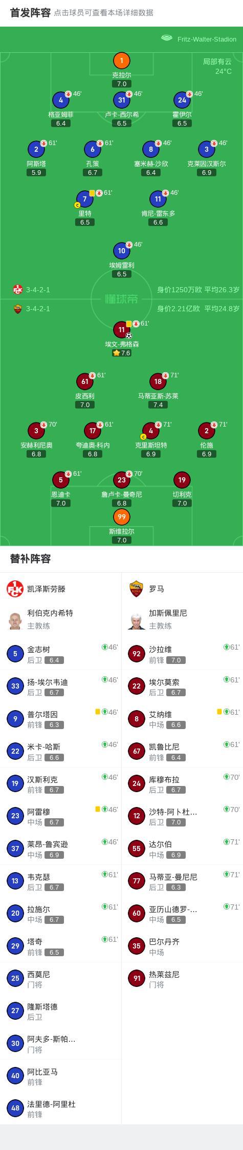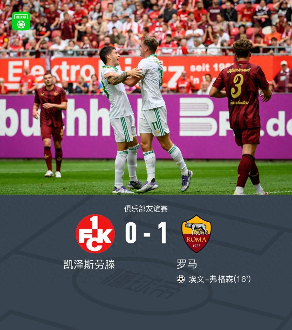 北京時間7月27日,俱樂部友誼賽凱澤斯勞滕迎戰羅馬。比賽中,羅馬球員埃文-弗格森成功打入全場唯一進球。最終比分凱澤斯勞滕 0-1 羅馬。