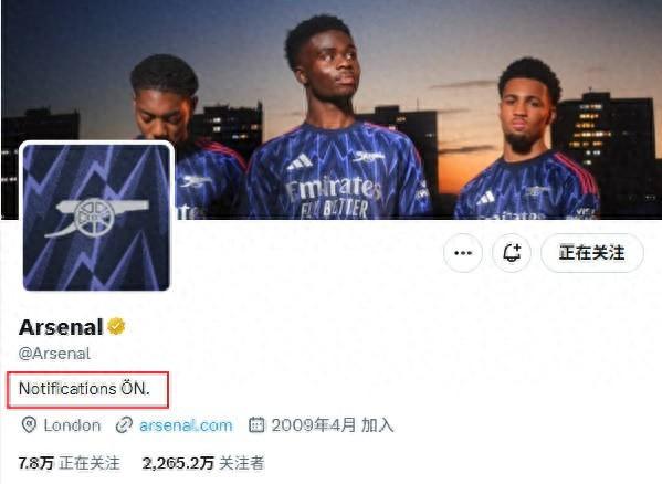 在阿森納官方社交媒體賬號的簡介中可以看到,他們已經將其修改成用“打開通知”,並且用的是哲凱賴什名字的字母“Ö”。