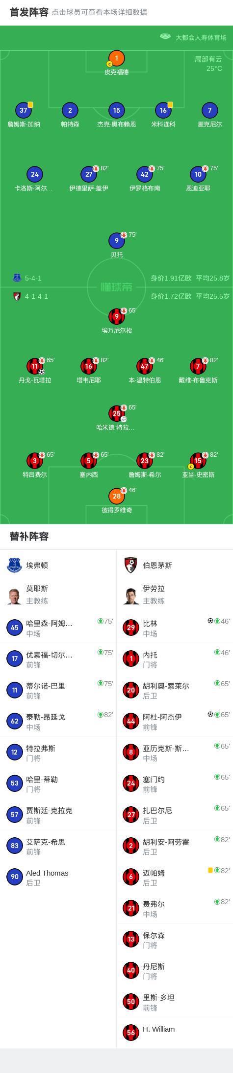 伯恩茅斯3-0埃弗頓,比林、阿杰伊、瓦塔拉破門