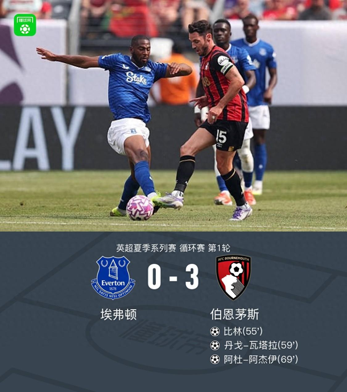英超夏季系列賽循環賽第1輪,埃弗頓與伯恩茅斯展開較量。比賽中,伯恩茅斯球員比林在一次進攻中成功破門,爲球隊首開紀錄。隨後,丹戈-瓦塔拉再下一城,進一步擴大比分優勢。比賽後段,阿杜-阿杰伊錦上添花,幫助伯恩茅斯鎖定勝局。最終,埃弗頓0-3不敵伯恩茅斯。