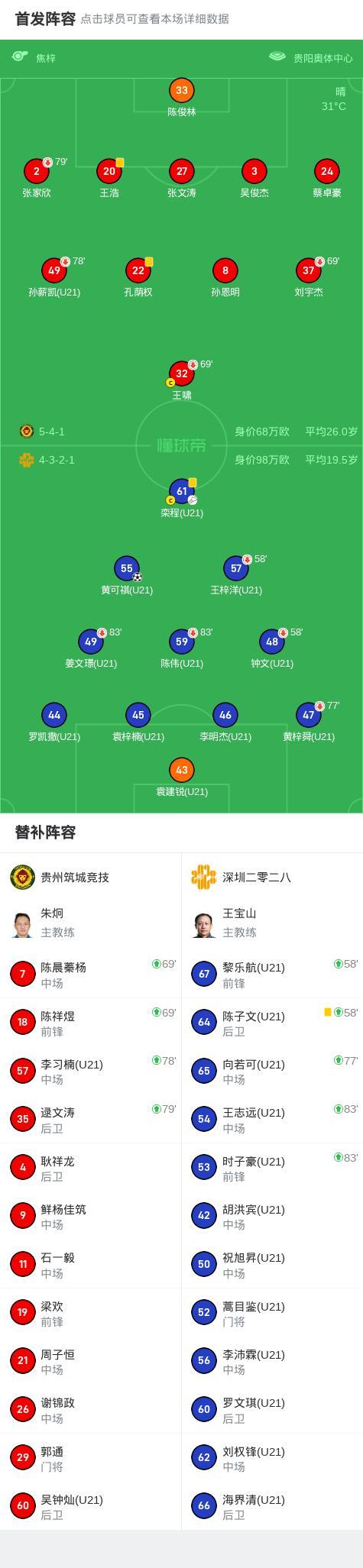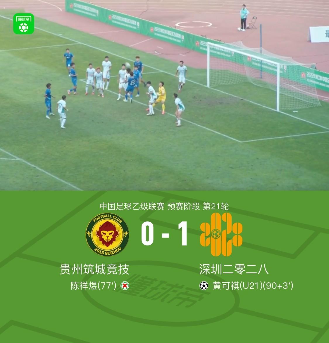 北京時間7月27日中國足球乙級聯賽 預賽階段 第21輪,貴州築城競技主場對陣深圳二零二八。第77分鐘,貴州築城競技隊陳祥煜罰丟點球,補時階段,深圳二零二八隊黃可祺頭球絕殺。最終,深圳二零二八1-0擊敗貴州築城競技,取得中乙五連勝。