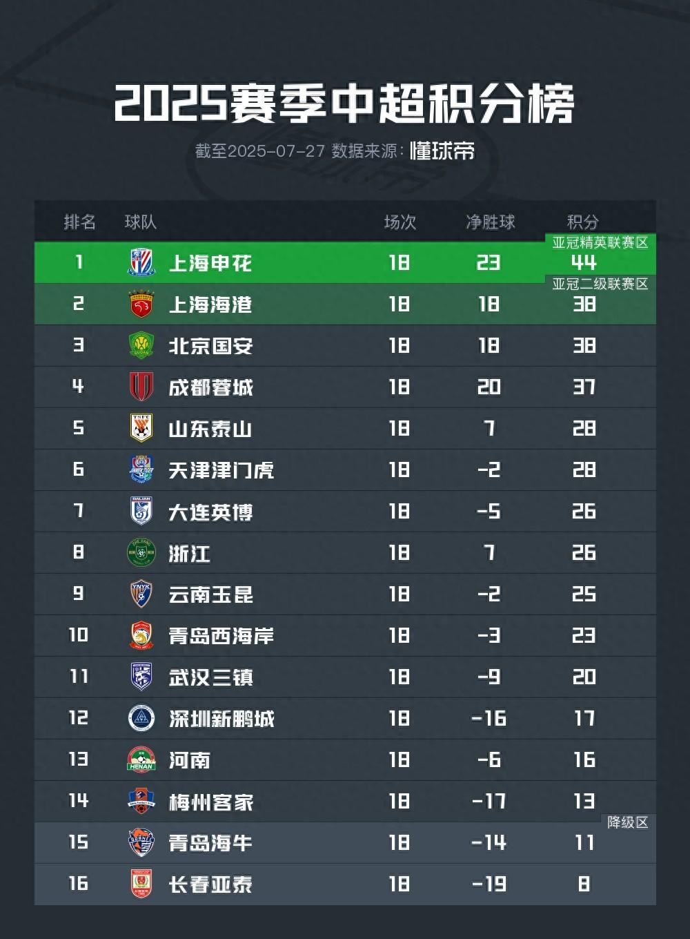 中超第18輪戰罷。積分榜上,上海申花隊取得了6分的領先優勢,上海海港與北京國安同積38分,成都蓉城積37分排名第四。
