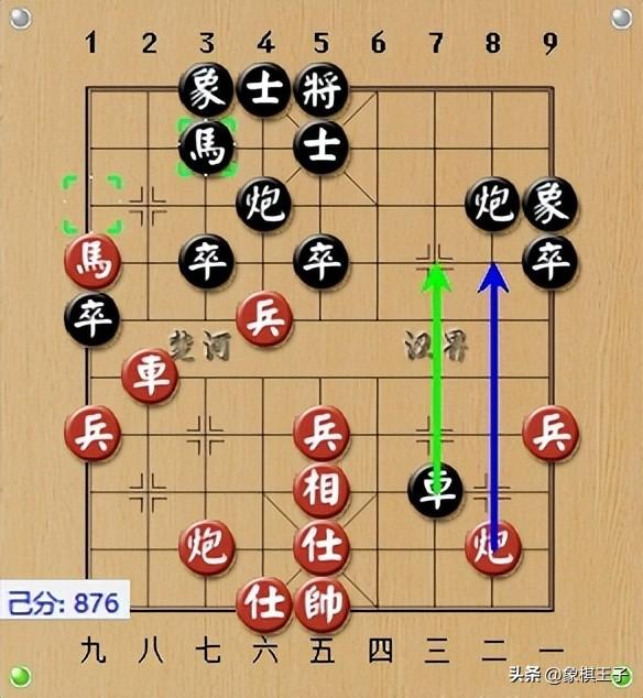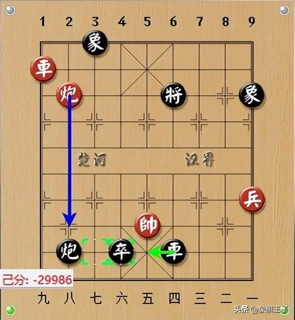 尹健索性棄子攻殺,以墊馬之力,前方一車連砍紅相,打出中炮,形成車雙炮的三子兇猛進攻。