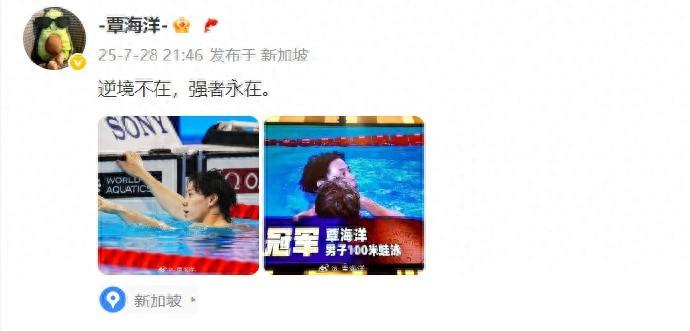 北京時間7月28日,2025年新加坡游泳世錦賽男子100米蛙泳的決賽爭奪中,中國選手覃海洋最終以58秒23的成績奪冠,這也是中國游泳隊本屆世錦賽首枚金牌。賽後,覃海洋更新社媒寫道:逆境不在,強者永在。