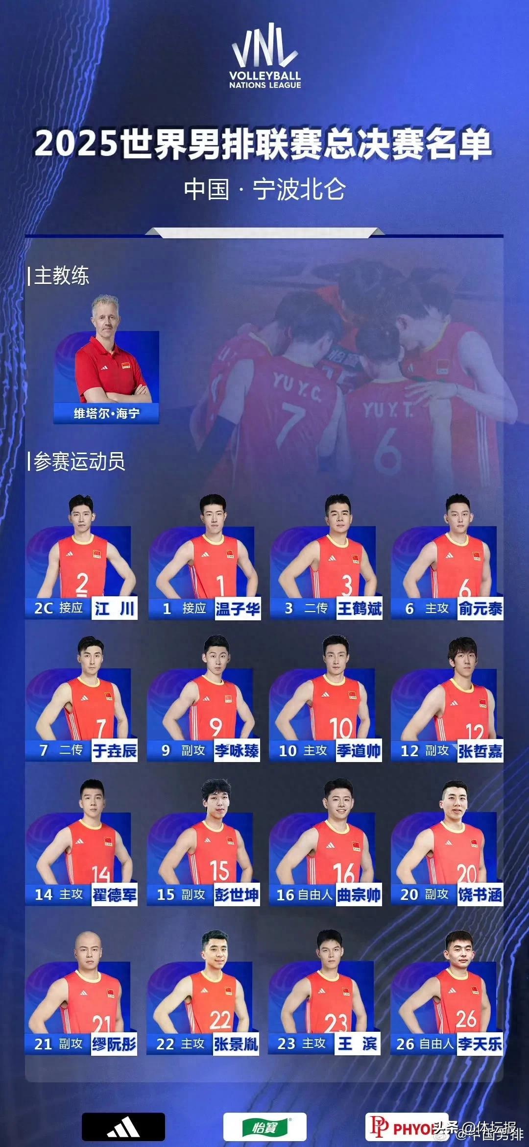 7月28日,中國男排官宣2025世界男排聯賽總決賽名單。名單如下: