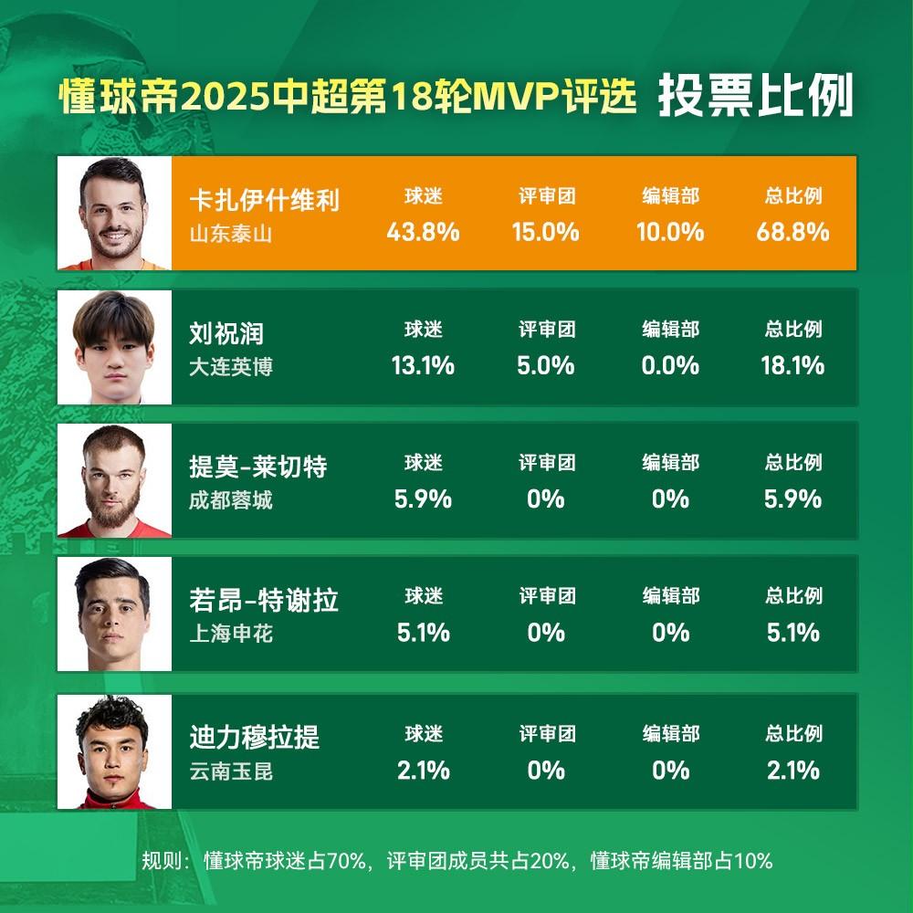 大家好,歡迎來到懂球帝2025賽季中超MVP評選現場。2025賽季中超第18輪MVP得主出爐,山東泰山外援卡扎伊什維利憑藉上演帽子戲法的滿分表現,以68.8%的得票率當選本輪MVP。這是瓦科第5次入圍懂球帝中超MVP候選,也是他首次獲獎。