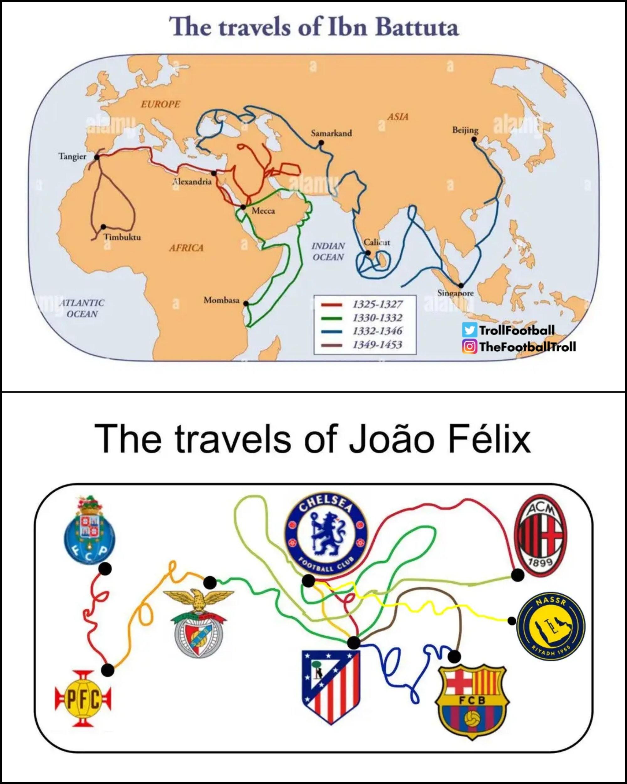 25歲的菲利克斯已經輾轉5國6隊,生涯總轉會費2.26億歐歷史第4